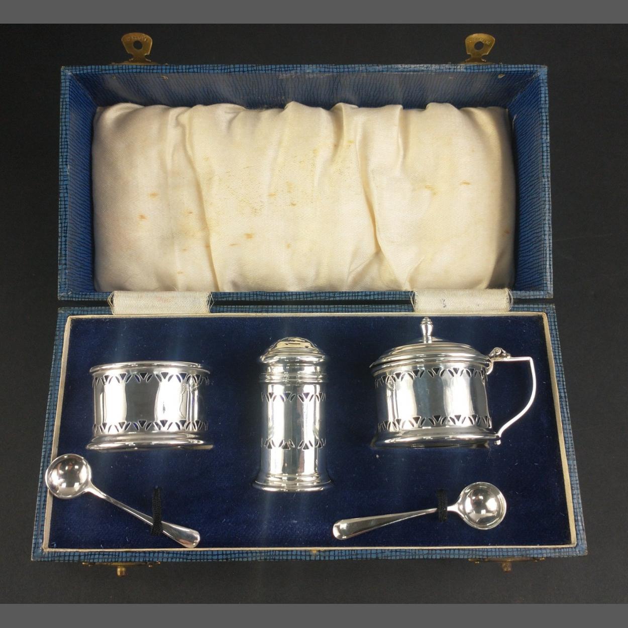 A boxed silver hallmarked, London 1933, condiment set comprising salt, pepper and mustard each with a blue glass liner, salt and pepper stand 5cm high, pepper pot 4.5cm, total gross weight 103g approx