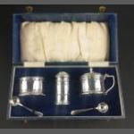 A boxed set of WILSON & SHARP silver hallmarked, Birmingham 1936, condiment set with salt, pepper and mustard and 2 spoons, Salt has blue glass liner and stands 5cm high approx, gross weight 132g approx, one or two small dents in one piece