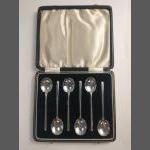 A boxed set of 6 SILVER hallmarked, Birmingham 1932, decagon-shaped coffee spoons with black coffee bean finials, each 10cm long approx, gross weight 42g approx