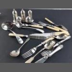 Three white metal sauce ladles including one by WALKER & HALL plus 4 each of EPNS fish forks and knives, a W&H fish knife and fork, a W&H salt and pepper etc