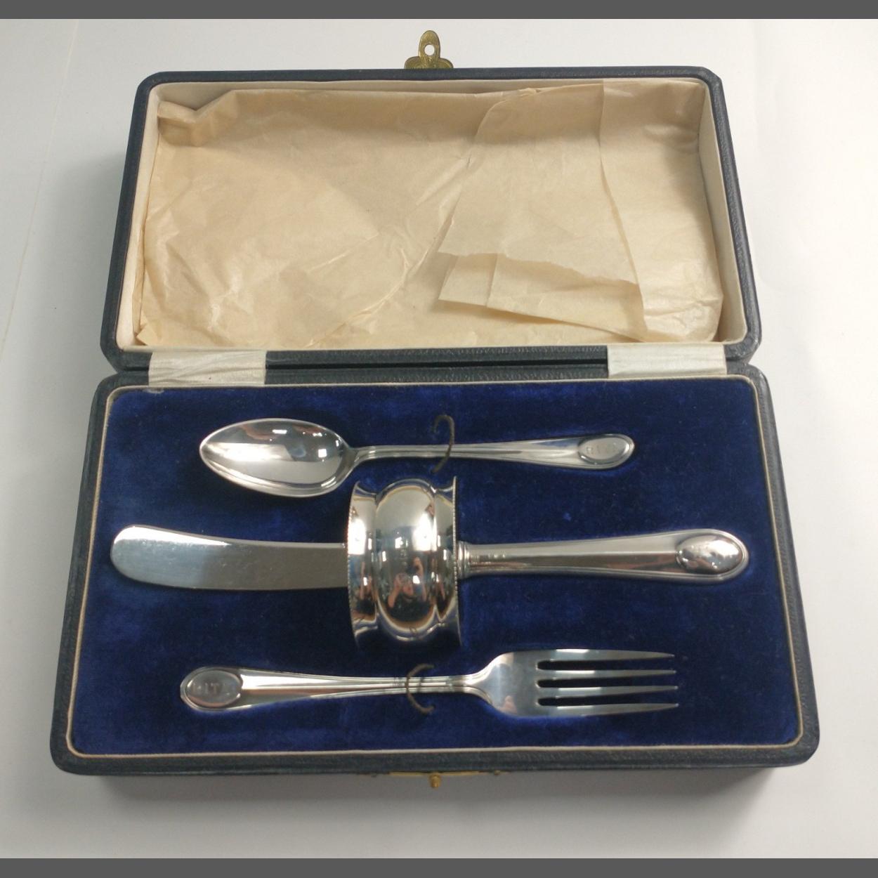 A boxed set of SILVER hallmarked, Sheffield 1924, cutlery inscribed to 'Rita' comprising fork, spoon, knife and napkin ring, knife 18cm long, weight 73g approx