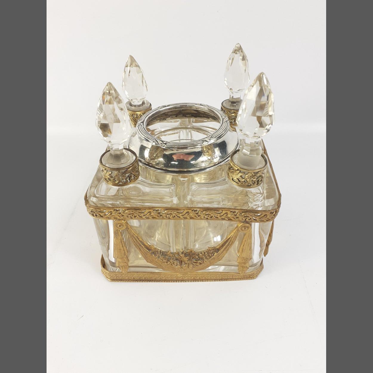 An UNUSUAL VINTAGE FRENCH adornment to a lady's dressing table comprising 4 stoppered bottles encircling a central glass bottle with a silver hallmarked collar, Birmingham 1912 (weight of collar 13g approx), all enclosed within a gold coloured decorative band measuring 11cm x 11cm approx