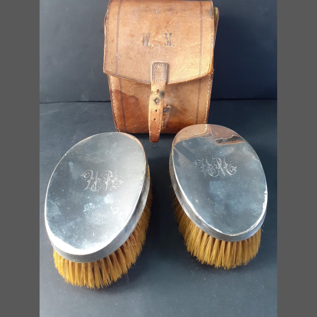 A pair of gent's travelling set of monogrammed hairbrushes SILVER hallmarked, Birmingham 1938, in leather case, gross weight 351g approx