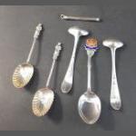 A mixed silver lot to include a STERLING SILVER automatic tooth pick case (5cm long), a pair of condiment spoons with indistinct hallmarks (10cm long), a souvenir Lille crest spoon, Birmingham 1945, (12cm long), 2 shell-shaped apostle spoons (10cm long) hallmarked Birmingham 1896. Total gross weight 53g approx