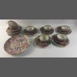 A highly decorative tea service in fine delicate china, decorated in Hong Kong comprising 7 cups, (1 with crack to base) 9 saucers, 10 side plates, 1 cake plate
