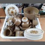 MIDWINTER STONEHENGE RETRO dinner ware to include 6 bowls, 6 soup bowls (1 with chip), 5 saucers, 7 cups, 1 egg cup, 7 side plates, 1 sauceboat, and also with FRESCO design - 6 side plates, 6 oval plates, 1 serving platter (35cm long) and 1 teapot, 1 lidded sugar bowl, 1 lidded casserole dish. Plus a boxed set of oval plate mats with Edinburgh scenes etc