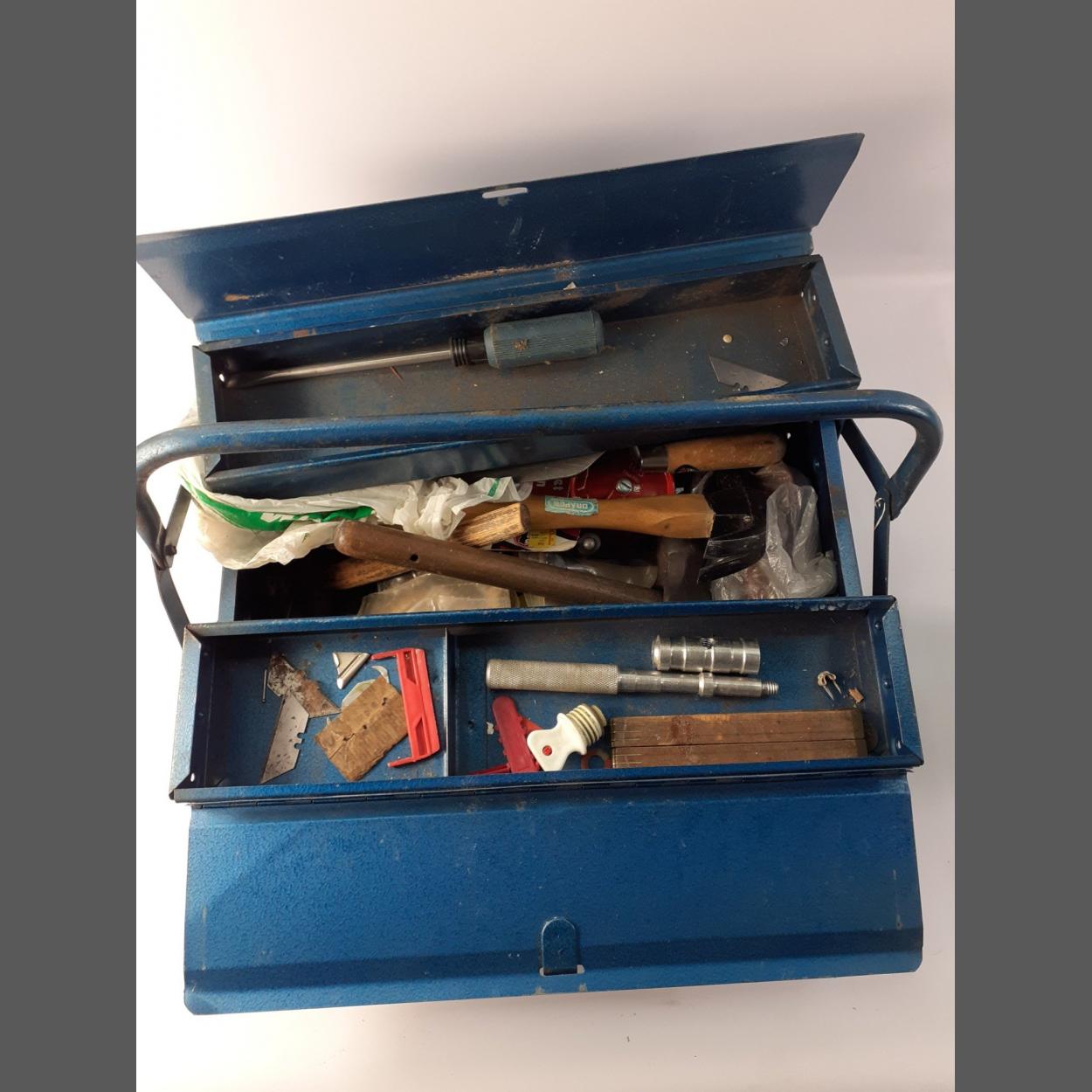 A blue metal canti-levered tool box 43x23x18cm (exc. handle) complete with contents of various tools
