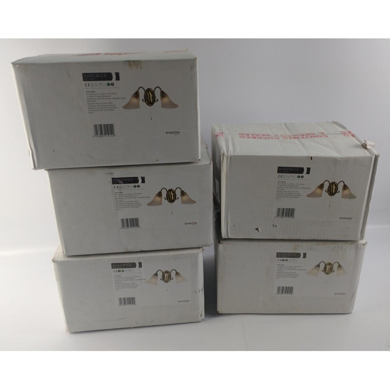 Five unused boxed HARDWICK wall lights antique brass plates and frosted glass shades, model 144-2AN suitable for 2 x 40W bulbs (24x17x37cm)