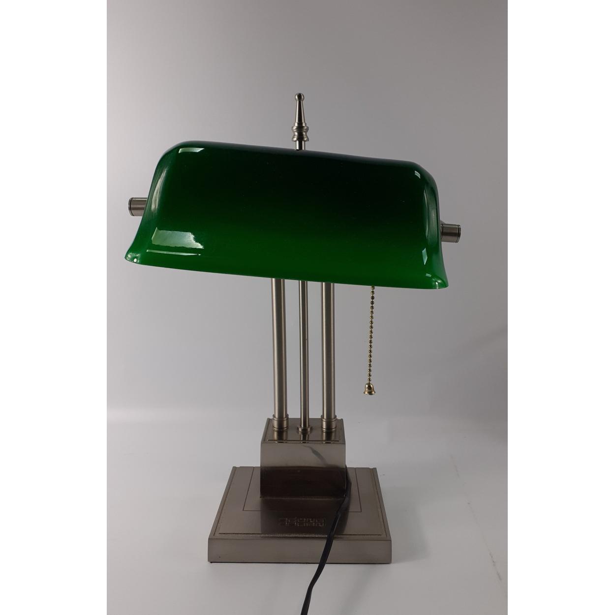 A modern retro banker's desk lamp with green glass shade. Chrome base with a brass light pull. Appears to have Dong Lian stamped on base. A very stylish lamp with a great look. Does seem to sit lightly askew.