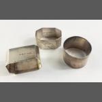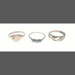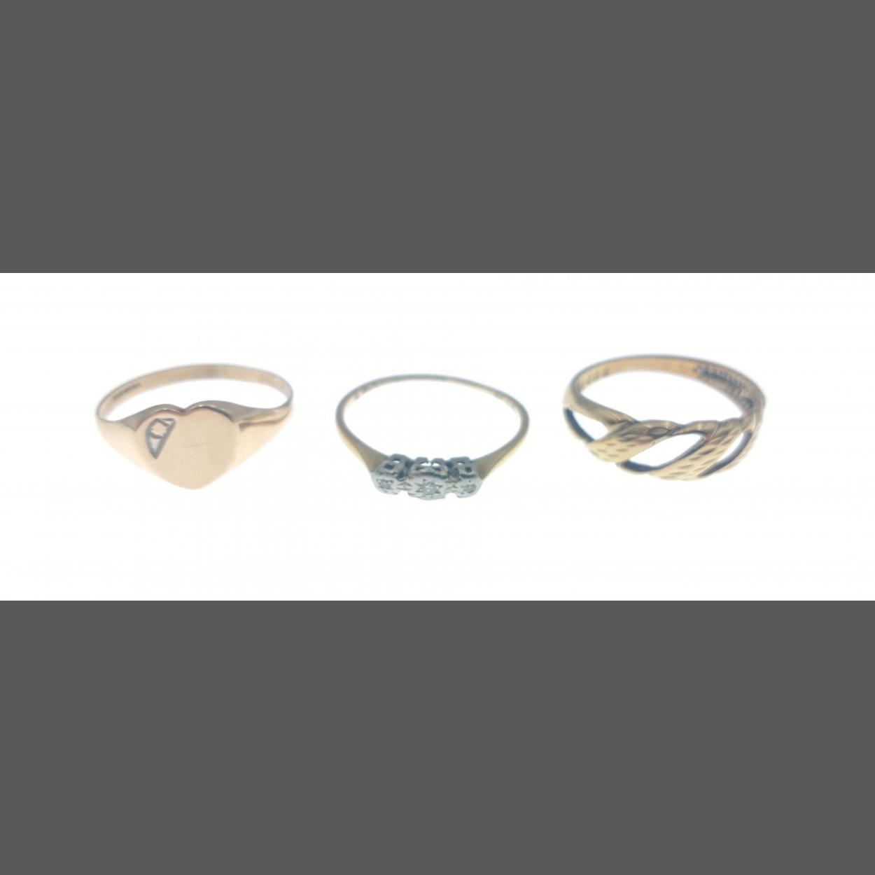 Three rings. One with three small diamond chips and marked 18ct Plat size N 1.3g approx, one yellow metal plain band with indistinct possibly 585 mark, size P 2.0g. The third a yellow metal heart band with indistinct stamps size O, weight 1.1g approx. Total gross weight 4.55g approx