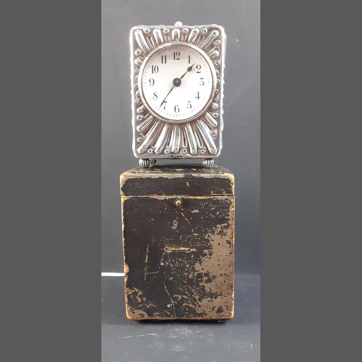 A STUNNING ANTIQUE SILVER carriage clock in travel case. In beautiful condition and ticking away nicely with a gentle wind on valuation and comes with key. Lovely white enamel 5cm dial. Hallmarked LONDON 1893 JB Case Maker. Velvet lined case with slider in place and catch works well. Stands 10cm tall approx. Gross weight 548g approx
