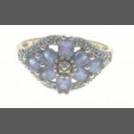 A 14K stamped 585 gold ring with a lovely cluster of eight lilac stones and diamond chips. Size Q gross weight 3.1g approx