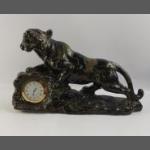 ARRGGHH! A powerful VINTAGE glazed pottery tiger guarding a mantle quartz clock with 7cm face. Tiger measures 37cm long and approx 21xm high and has no signs of damage
