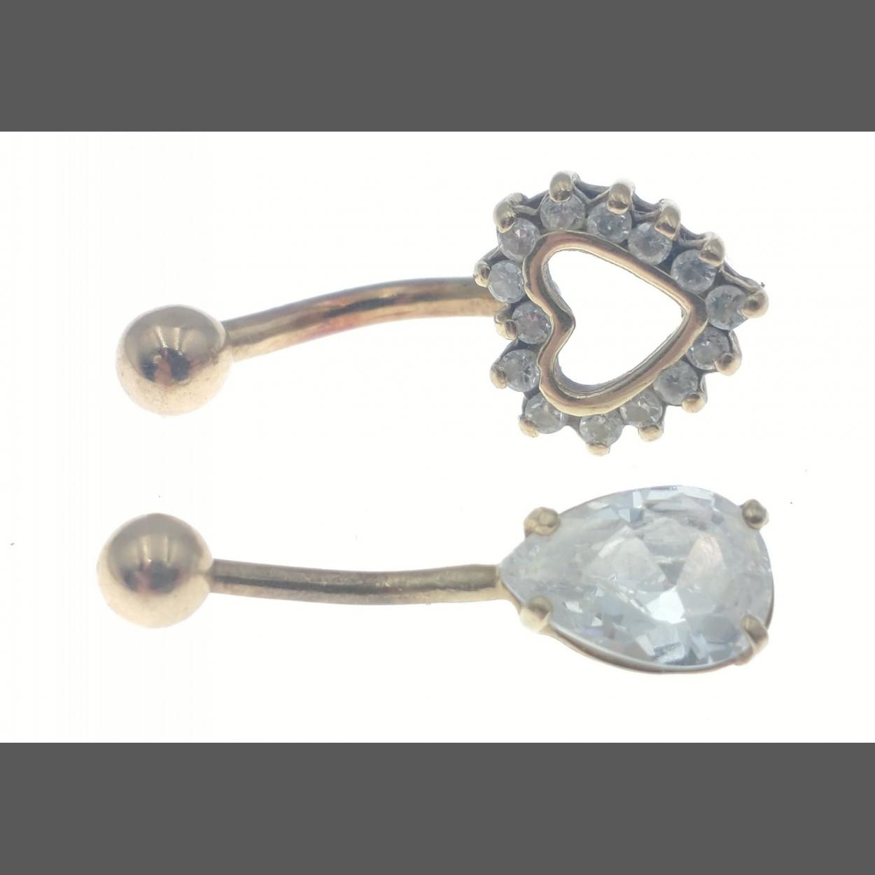 Two small 9ct gold marked belly bars one with a blue stone and the other with a heart surrounded by white stones. Total gross weight 2.5g approx