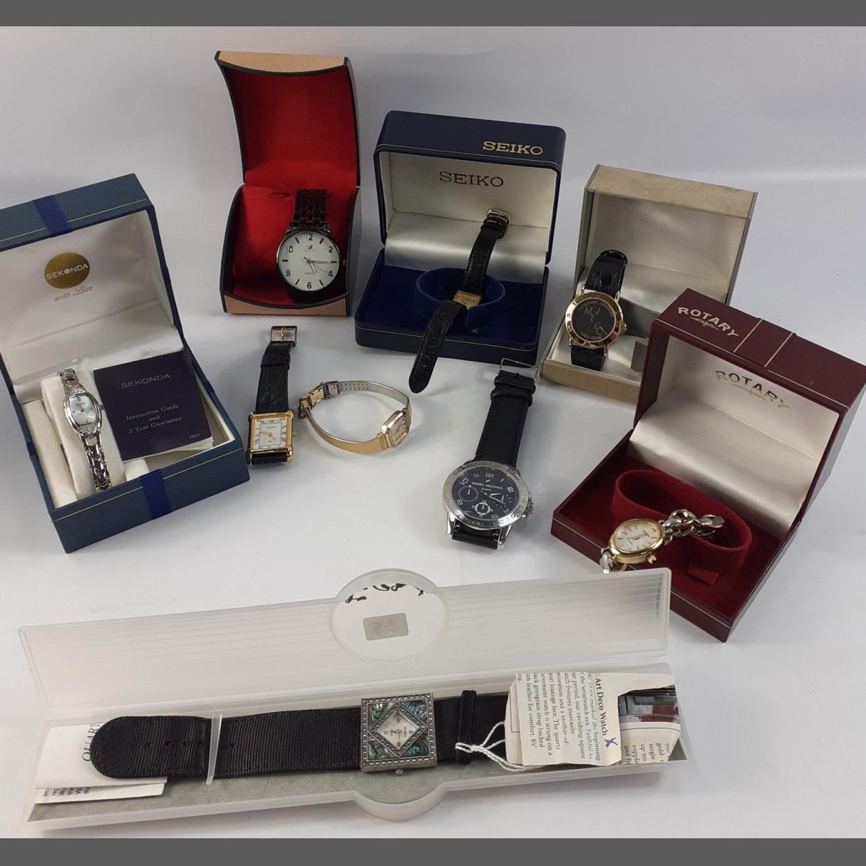 A collection of nine dress watches to include SEKONDA, ACCURIST, ROTARY, SEIKO, etc. May need batteries.