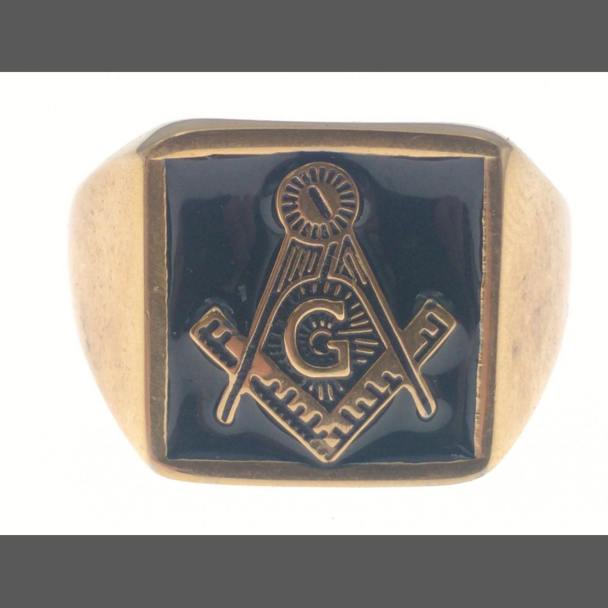 A LARGE ‘unmarked yellow metal' Masonic signet ring with square & compass symbol set in enamel - ring size Y/Z gross weight 11.36g Approx