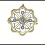 BEAUTIFUL! A Vintage 375 stamped yellow gold pin brooch with a large round cut AMETHYST and 4 supporting smaller amethysts / - weight gross 2.395g approx - dimension 2.5cm diameter approx - comes in a vintage Hawick jeweller's box