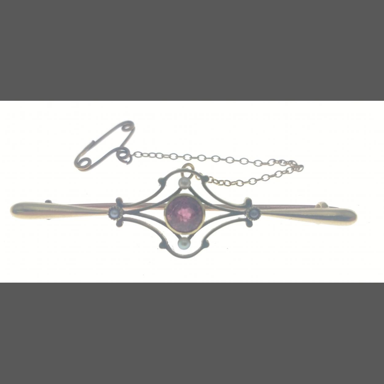 Yellow metal bar brooch stamped 15ct with pink centre stone and four seed pearls and safety chain. 54mm approx. Gross weight 3.85g approx. Pin appears to be a replacement and centre stone has a chip.