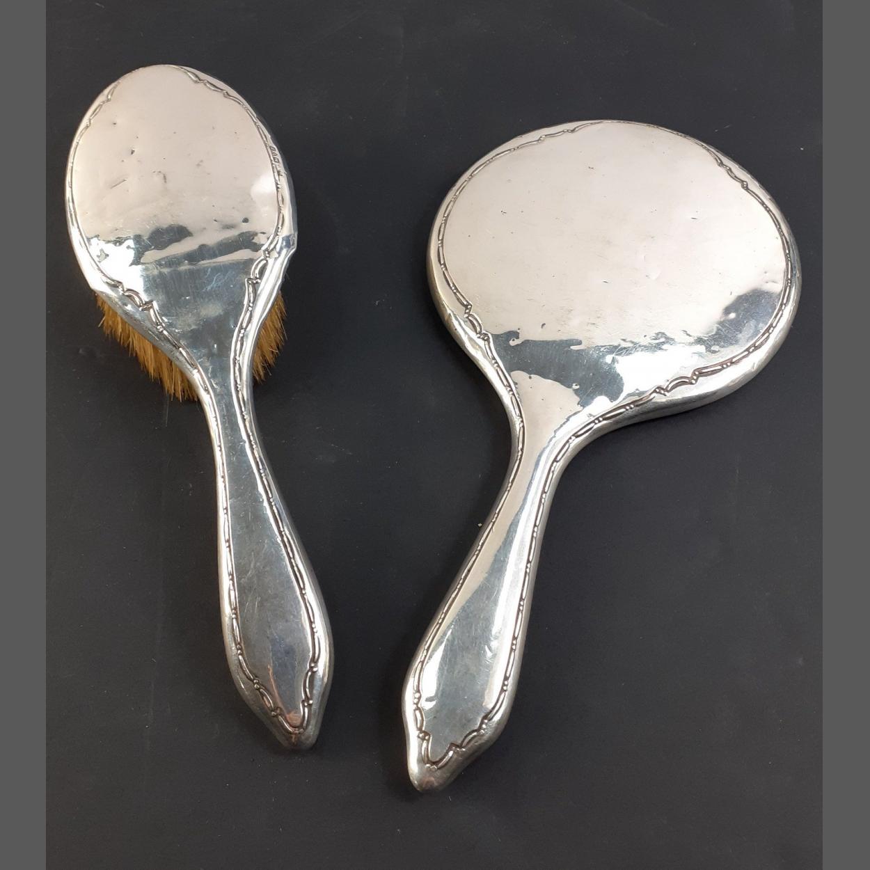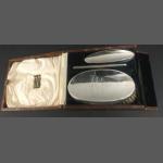 WALKER & HALL silver dressing table table comprising mirror, and three brushes. Lovely clean bright condition in super fitted case. Sheffield 1930s. Total gross weight 560g approx.