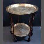 An UNUSUAL AND CHARMING c1920's Chinese folding table with two brass circular top trays - each with traditional etched scenes - top tray dimensions 53cm diameter and smaller lower tray 42cm diameter x height 67cm Additional info; this table belonged to one family who brought it back from China in the 1920's