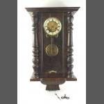 A vintage wood wall clock in good order. 68cm tall complete with keyand pendulum but untested.