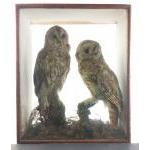 Two taxidermy TAWNY OWLS in a case. Older taxidermy example with naturalistic branch base. Case size 52cm high, 43cm wide, 20cm deep.