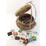 An Indian straw snake charmer's lidded basket containing a collection of matches and match book covers. Nice collection.
