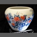 This is a very substantial piece of hand made Chinese porcelain, measuring approximately three and a half feet in diameter and very heavy. This pristine white porcelain fish bowl has been completely painted by hand with a floral scene on one side and Chinese characters on the other side. This is a very large piece so please check the sizes and we estimate to be between 100 and 150kg. Origin Foshan Guangdong Province Circa 1990. Condition very good.. H: 80cm W: 110cm D: 110cm