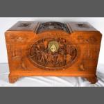 A rare old Chinese chest hand carved and detailed with Chinese men on horseback Origin Ningbo, Zhejiang Province Circa 1950s Condition reasonable for its age.. H: 61cm W: 103cm D: 51cm