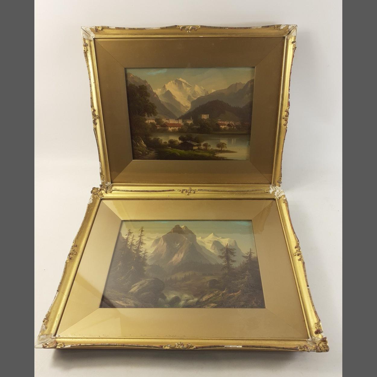 A pair of attractive framed early 19th Century Alpine landscapes. Some damage to frames. Frames measure 45cm x 33cm approximately.