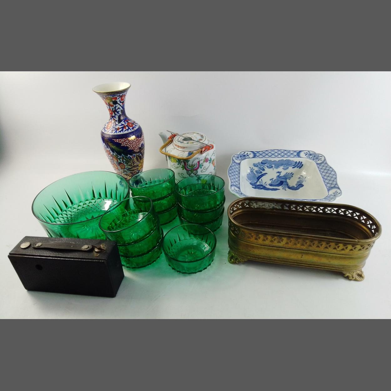 Mixed lot to include green glass bowl and sundae dishes, brass plant basket and Oriental style pieces along with a box Brownie camera.