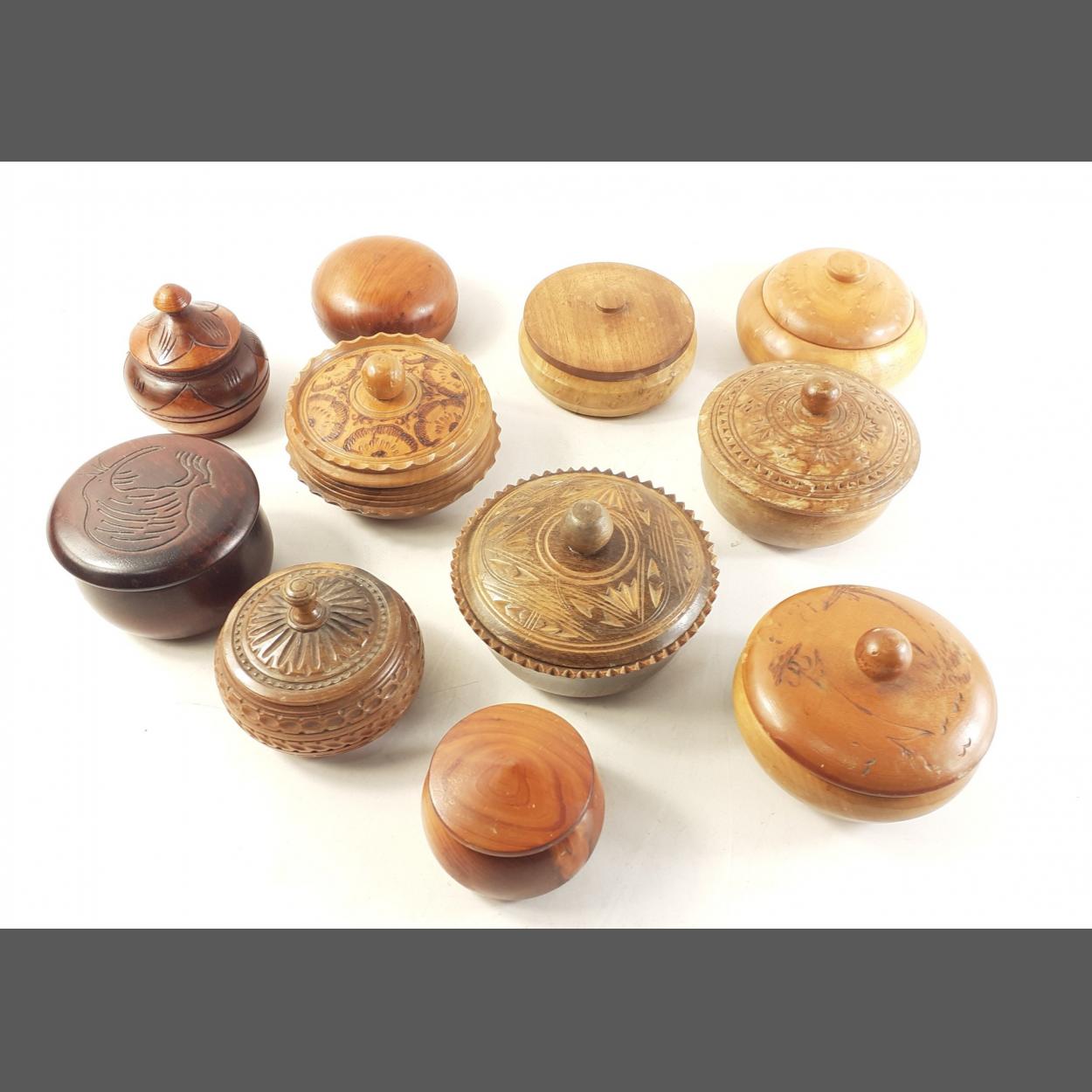 A lovely collection of 11 wooden trinket boxes, many carved. Largest approx 10cm diameter.