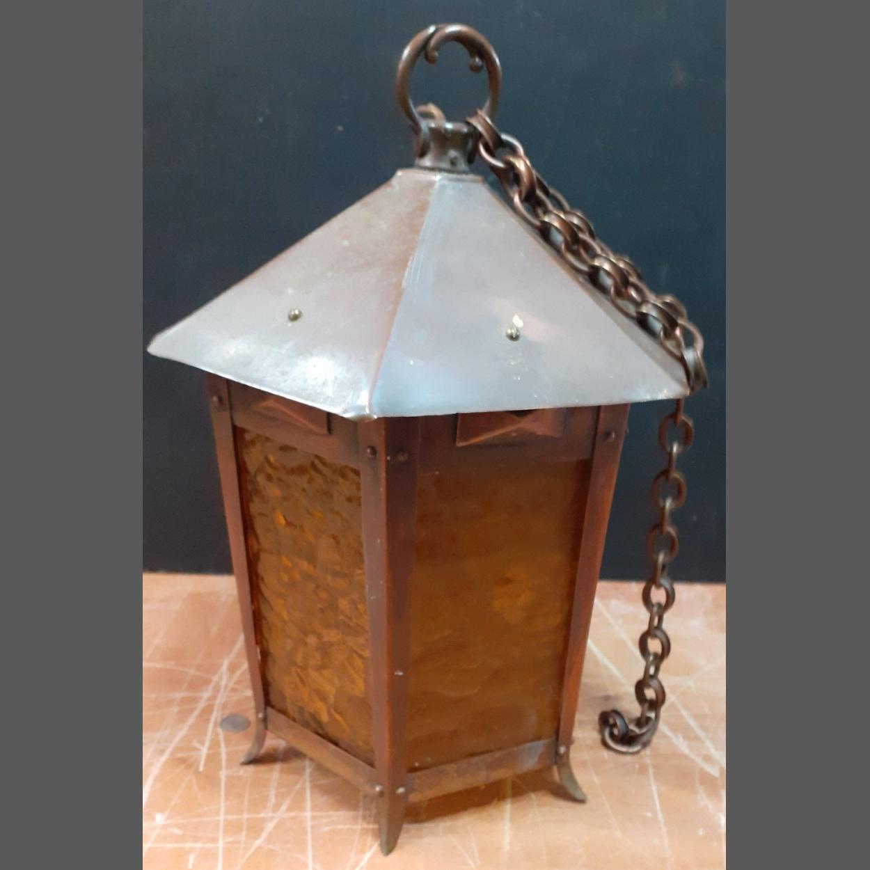A lovely VINTAGE copper and amber glass electric porch ceiling lamp - quite UNUSUAL - dimensions 32cm height x 25cm diameter approx