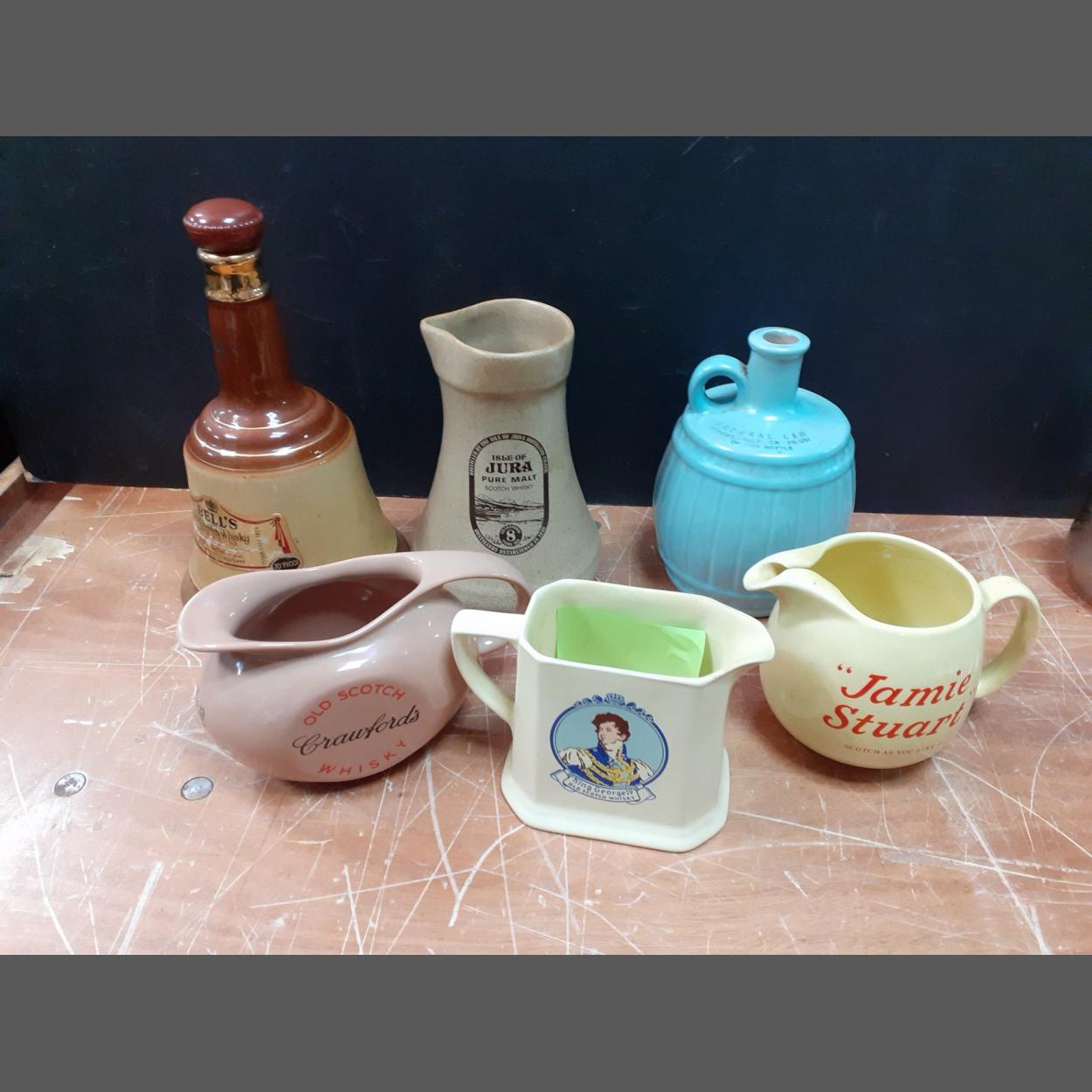 A collection of whisky decanters and whisky water jugs to include Isle of Jura, Jamie Stuart, Crawfords, Bells and King George IV etc
