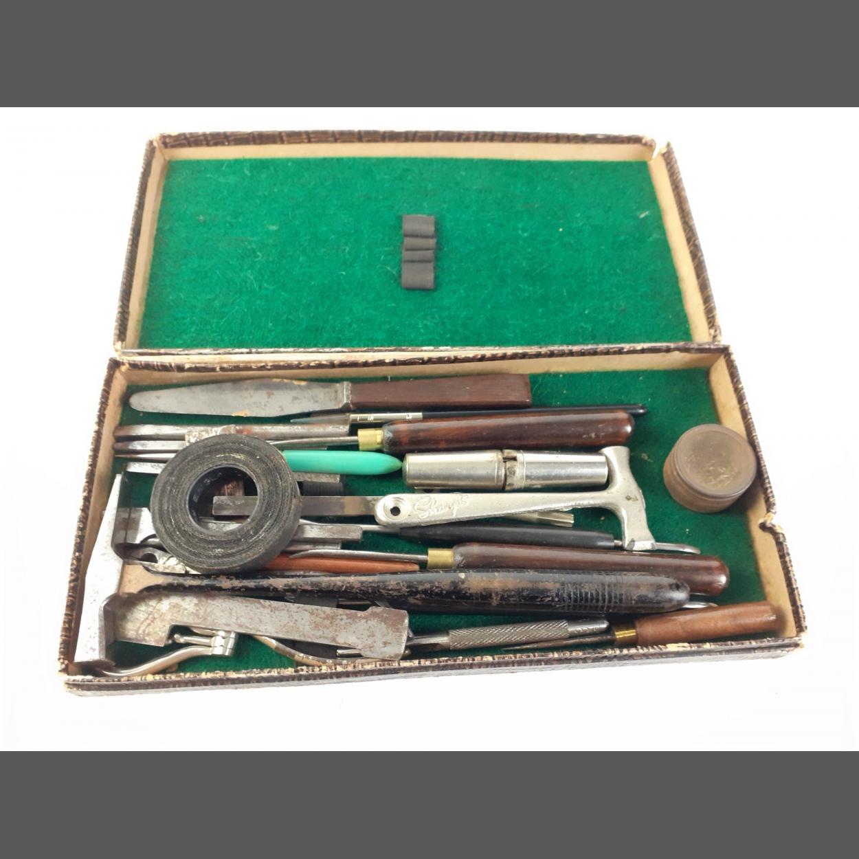 A box of interesting vintage arts 'n' crafts tools including small hammers, bradawls etc