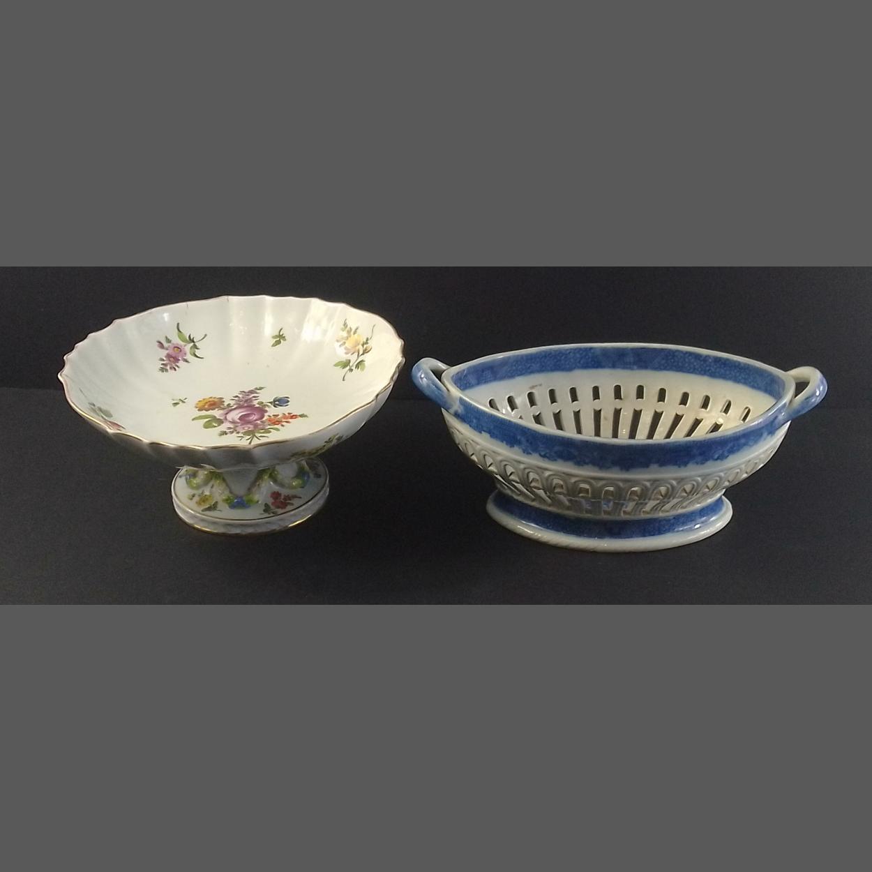 A MEISSEN floral decoration fruit bowl standing 11cm approx, 22cm diameter. In good condition with no chips or cracks. Minor glazing cracks at rim. Bowl rings true. Also a blue and white English porcelain pierced basket bowl with a small chip to rim and a minor crack internally.