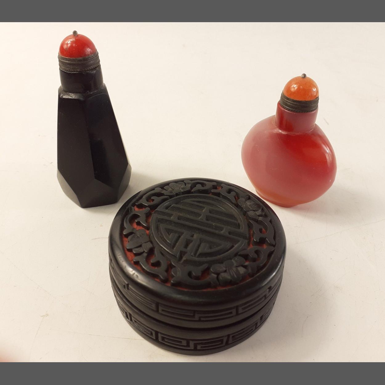 Small lot of Oriental interest to include 2 Chinese agate snuff bottles with coloured stoppers (taller 8cm approx) and an attractive Chinese red and black cinnabar pill/trinket box.