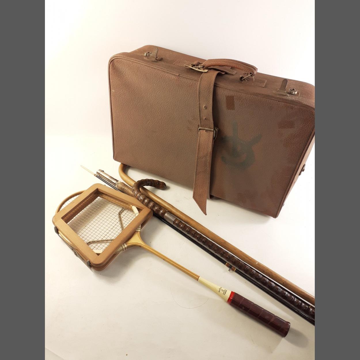A mixed lot to include a brown suitcase, wooden hand-made badminton racquet, various walking sticks and a fly rod