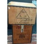 A pair of ANTIQUE wooden tea chests stating BUTLERS LONDON INDIAN TEA dimensions height 55cm x 50cm square top approx and MELROSES TEA AND COFFEE labelled MERCHANTS tea chest - dimensions height 60cm x width 53cm x depth 43cm approx