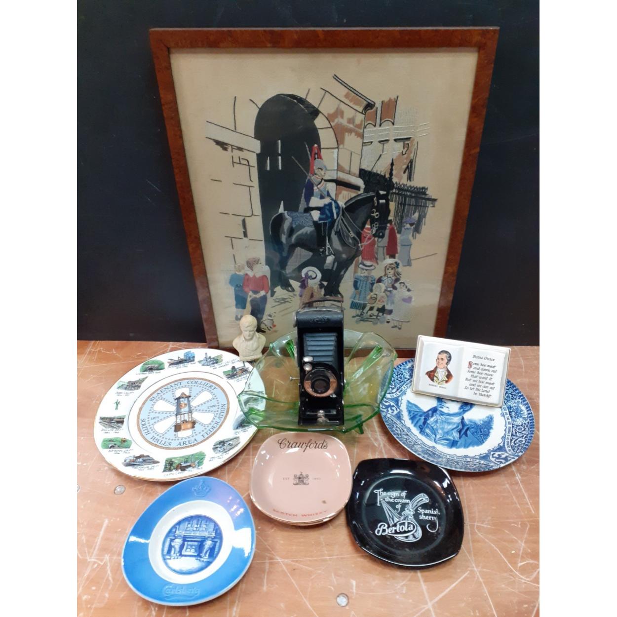 A nice collection of COLLECTIBLE items to include A KODAK 20 Junior folding 6 camera, a URANIUM Art Deco large dish and an art work of a mounted guard dimensions 54cm height x 44cm width approx and much more