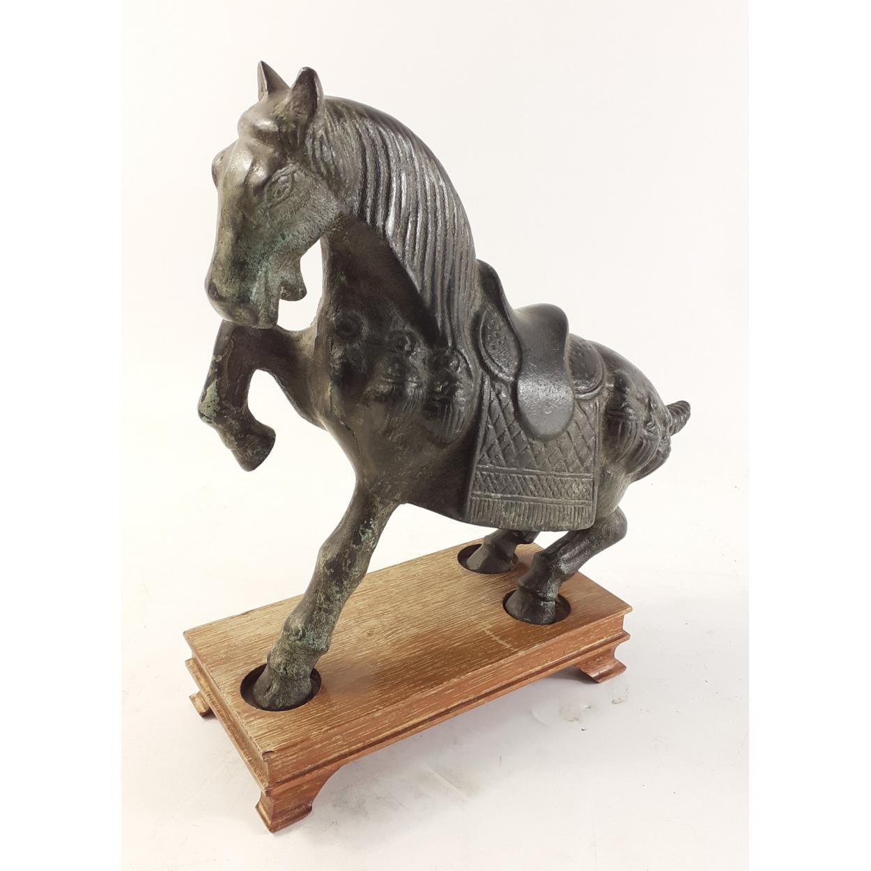 A very striking bronze Chinese style war horse on wooden plinth. Stands 22cm tall approx