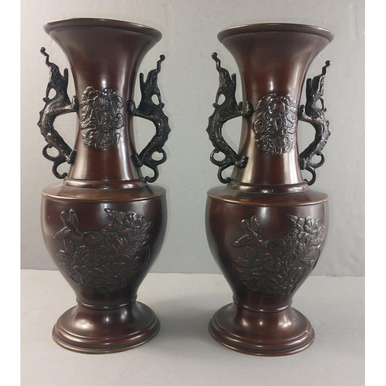 A pair of bronze Oriental vases with dragon handles, each 31cm tall approx.
