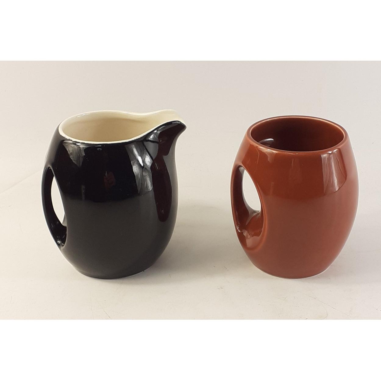 A vintage HOLKHAM Pottery owl eye mug and a similar style milk jug.