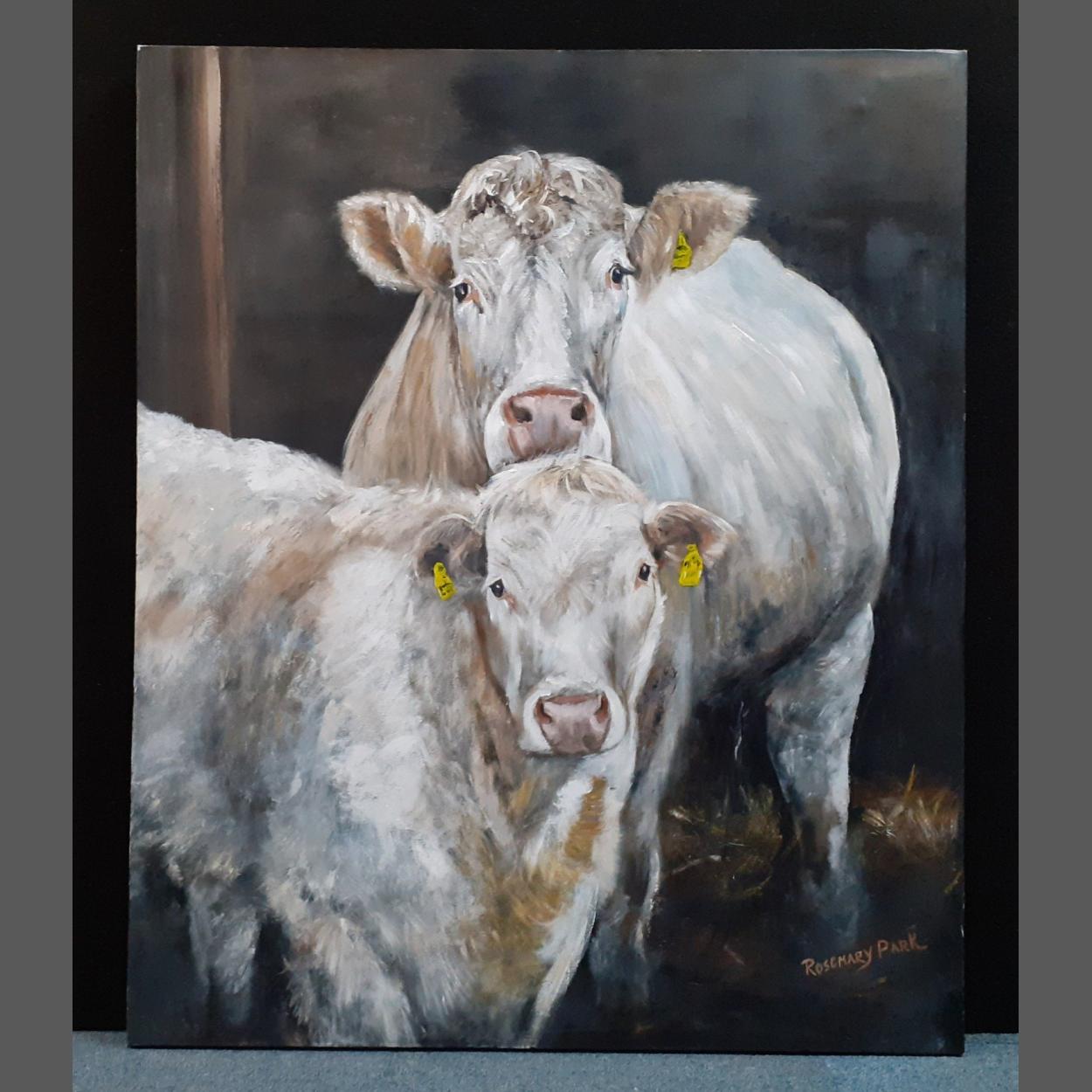 A large modern canvas of a white cow with calf by ROSEMARY PARK 120x100cm approx