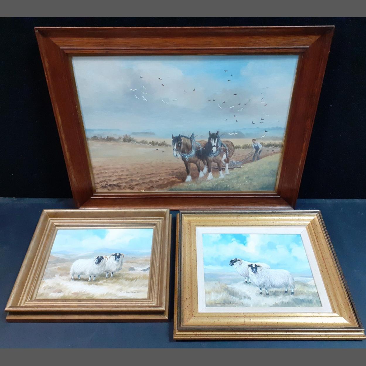 Three country pictures including 2 small pictures of sheep by MARJORY STEPHENSON and the larger ploughing scene by M MATTHEWS (58x46cm approx)