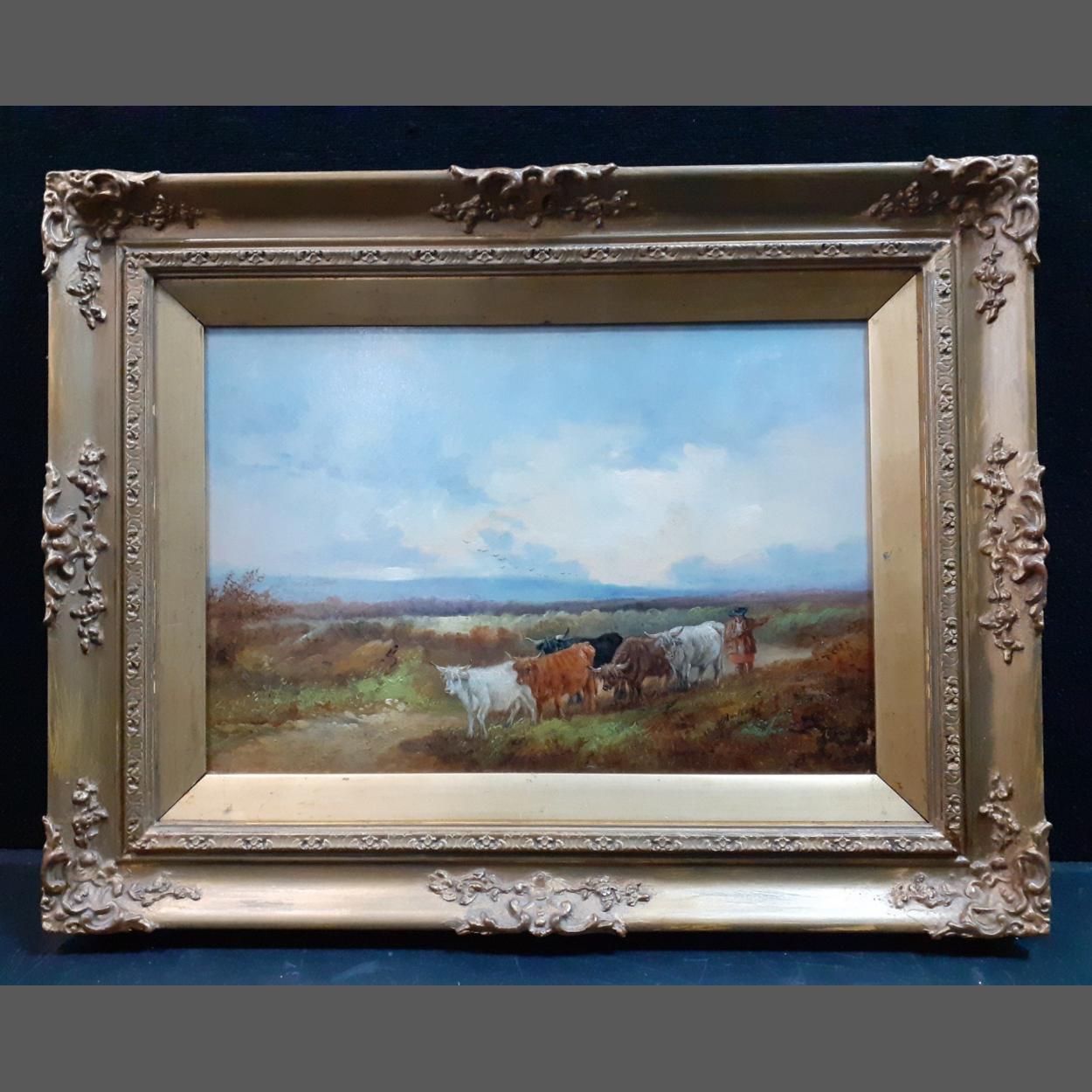 A 19th century oil on canvas of a Scottish country scene featuring Highland cattle in gilt frame. Frame size 87x52cm approx