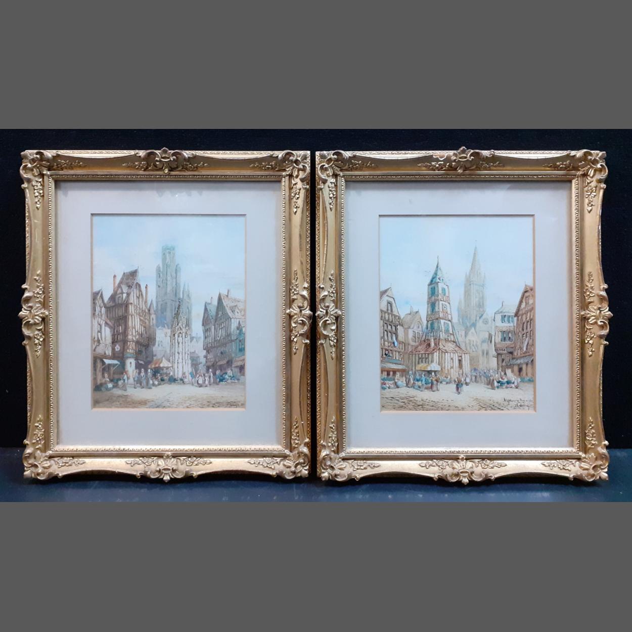 Two coloured sketches by H N SCHAFER (Henry Thomas Schafer, British (1854-1915) of Rouen and Honfleurs in gilt frames . Frames 42x36cm approx