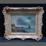An oil on canvas in a heavily embossed frame, of a coastal scene entitled Fifeshire Haven signed by ROBERT WEST NAPIER FRSA, FSA Scot (1876-1962). Some damage to frame, frame size 64x54cm approx.