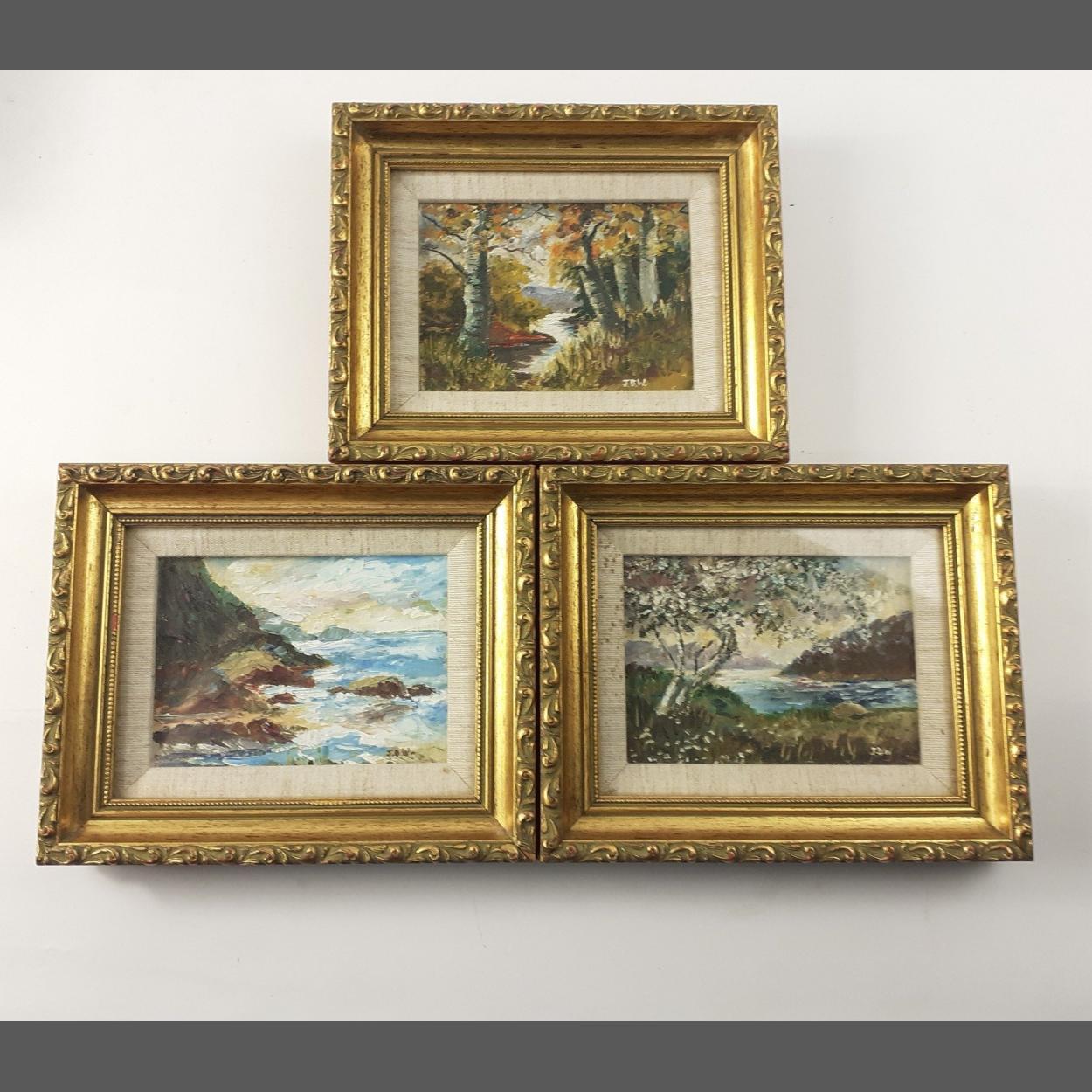 Three framed and glazed oil paintings initialled JBW. Two of coastal scenes and one of a country scene. Frames measure 20x16cm approx