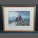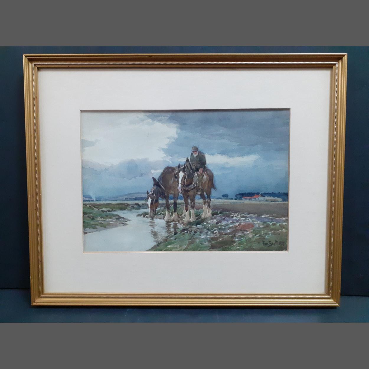 A TOM SCOTT (1854-1927) original water colour dated 1916. A wonderful Scottish scene of an elderly ploughman watering the Clydesdale horses after a hard day's work. An atmospheric and accomplished Scottish agricultural scene. The image measures 25cm x 17cm. In excellent condition with no staining or fading. Framed by Ted Drahony, Brechin, Scotland. A wonderful opportunity to acquire this original painting.